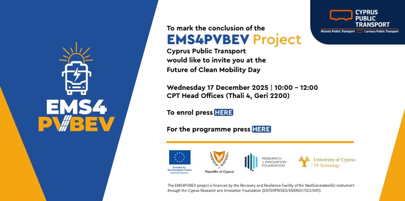 The EMS4PVBEV consortium organized the final project workshop to present key experimental results and share valuable lessons learned from the operation of the PV-battery system. The event, held on 17 December 2025 at Cyprus Public Transport workshop premises in Geri, Nicosia, included project presentations, a live demo of the solution and an on-site tour of the EMS4PVBEV infrastructure. The workshop invitation is shown below.